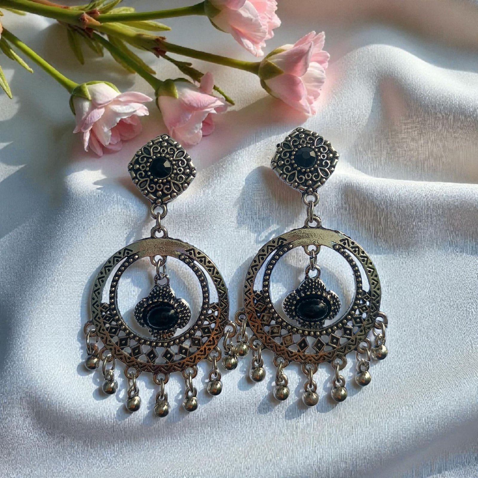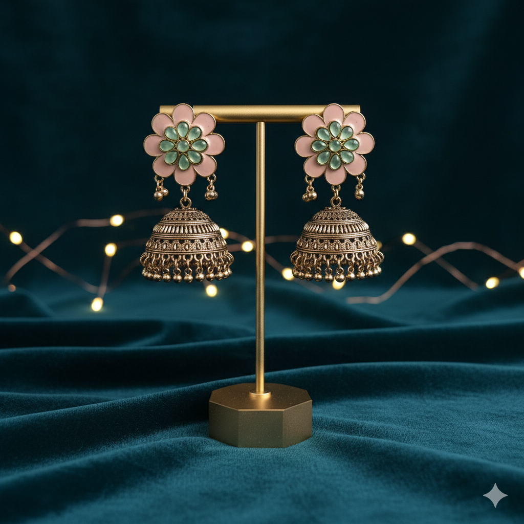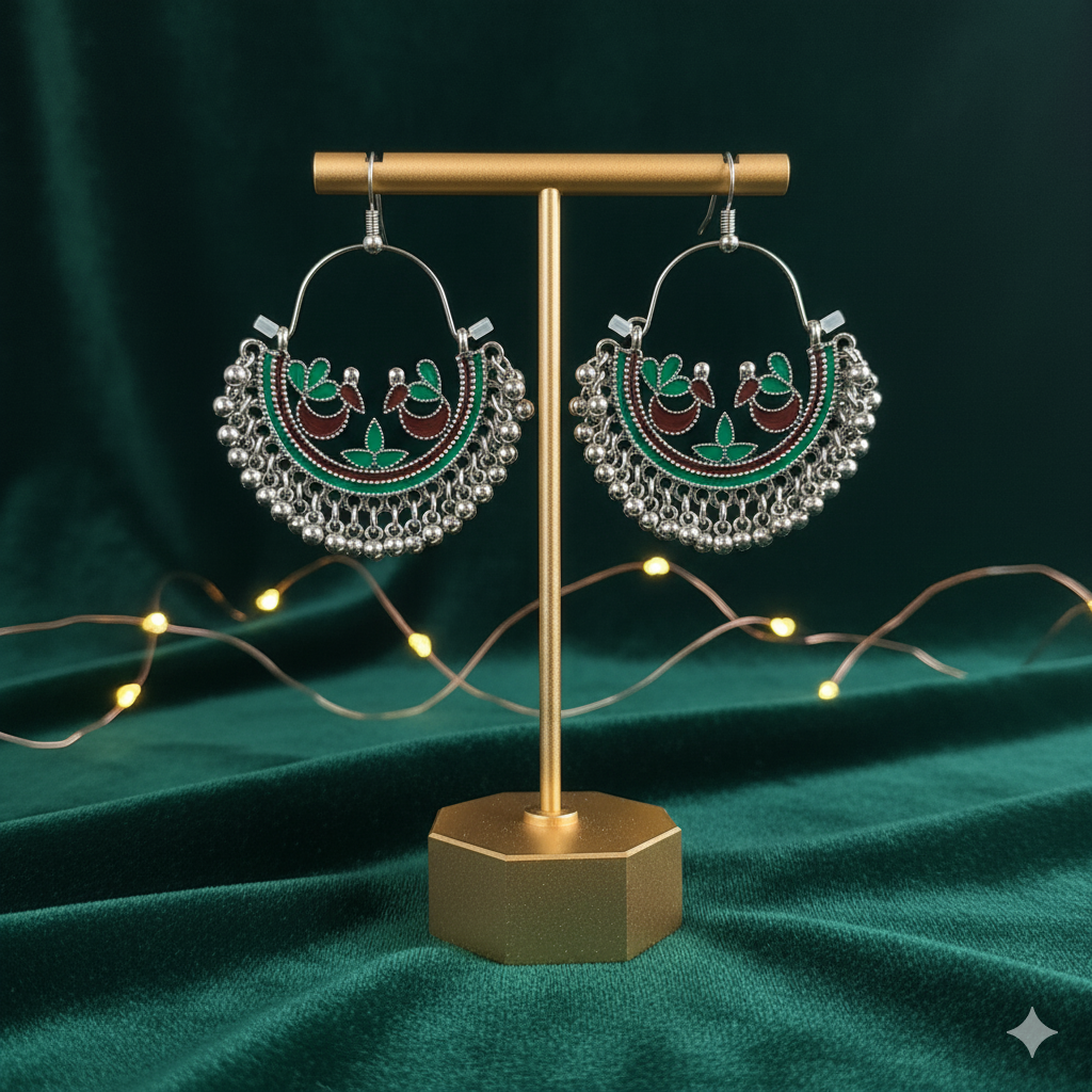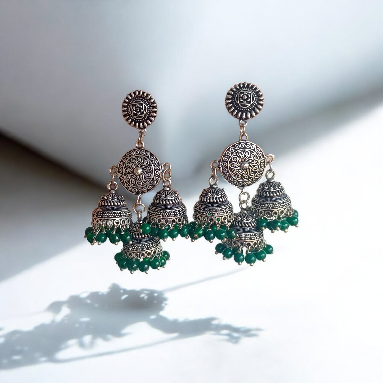 Triple Tier Oxidised Jhumka with Emerald Green Beads