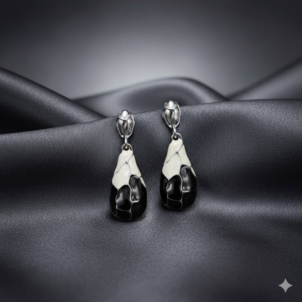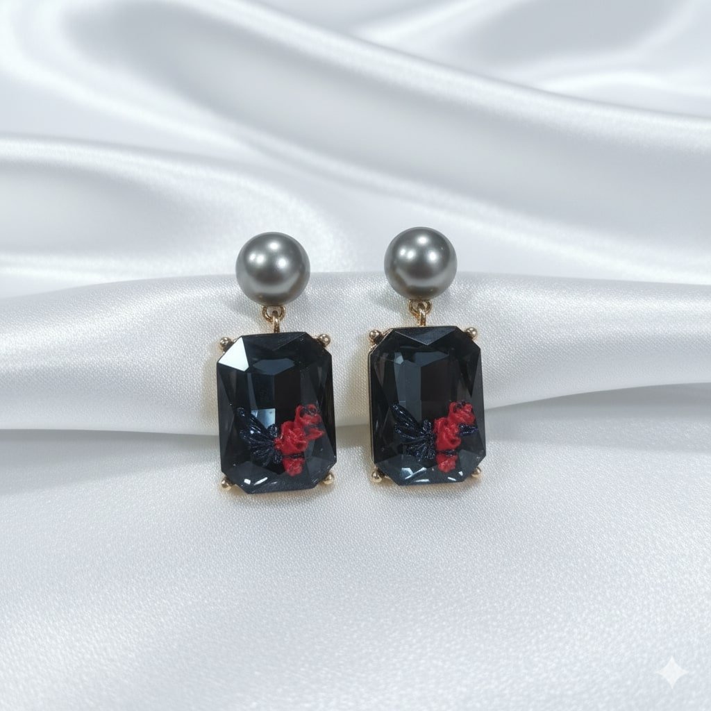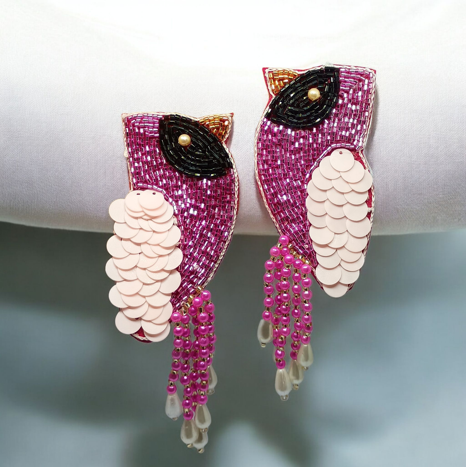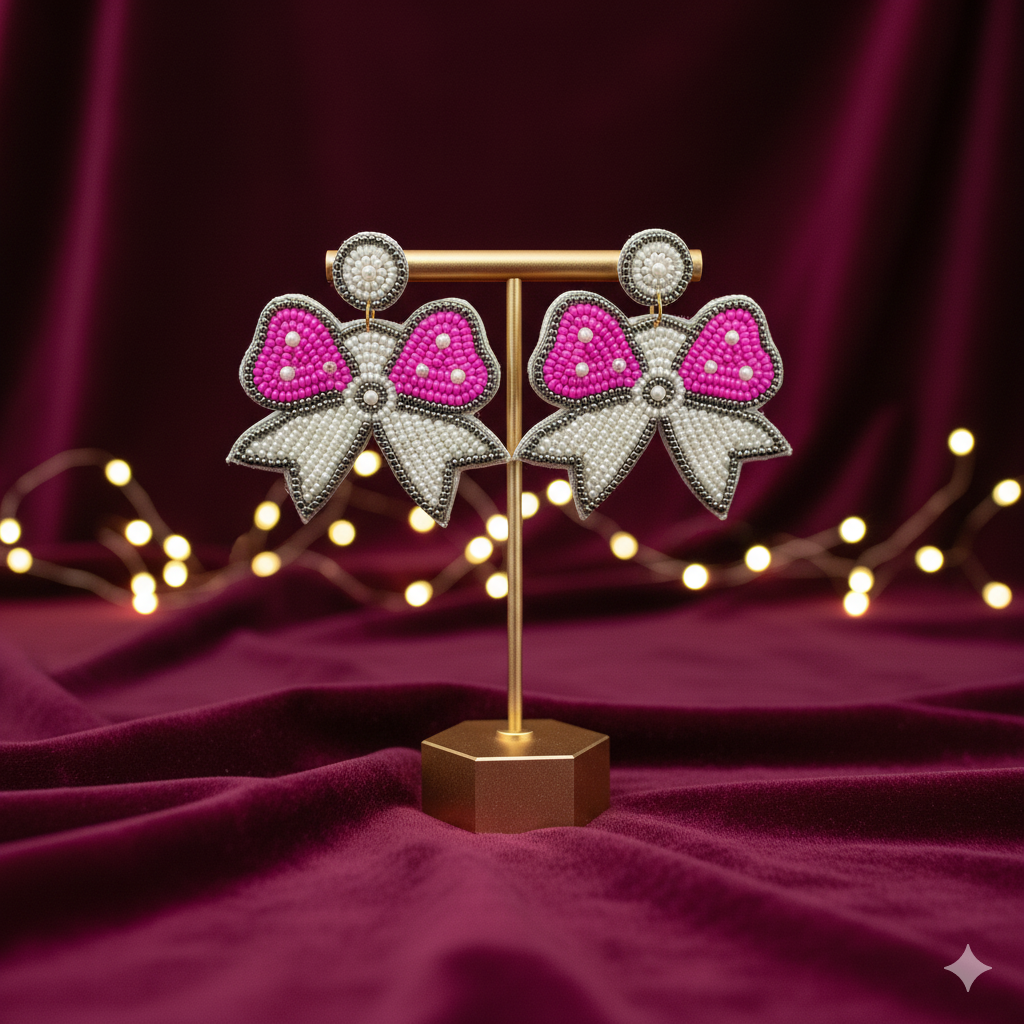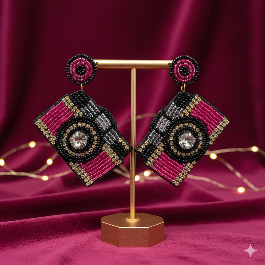 Exquisite Beaded Pink and Black Camera Dangler Earrings