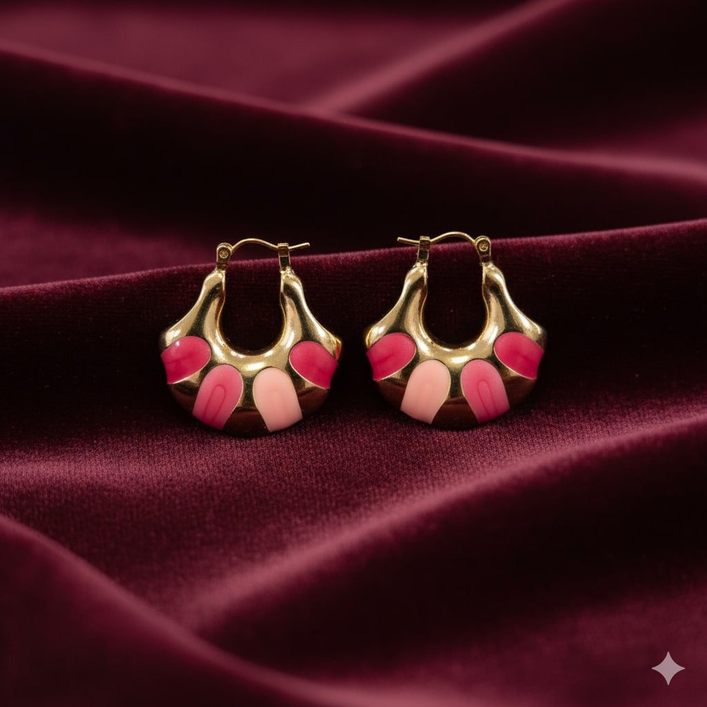 Enamel Green and Pink Kundan Hoop Dangler hanging on a stand