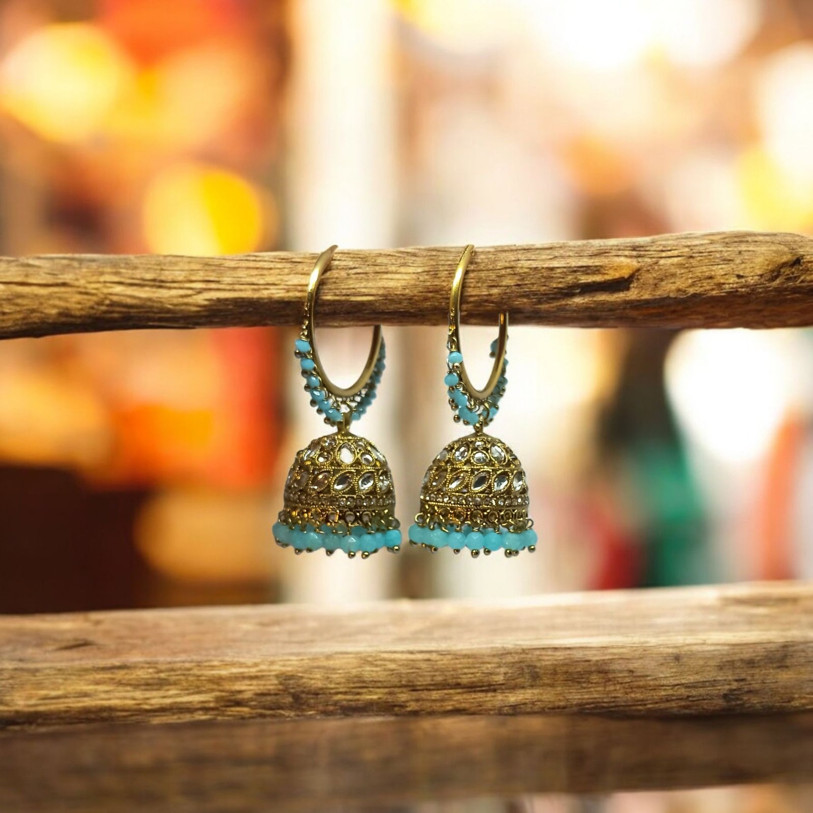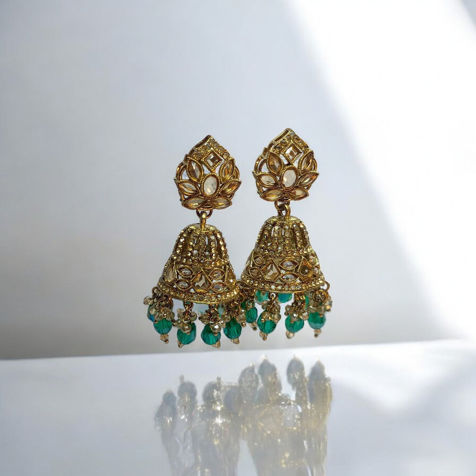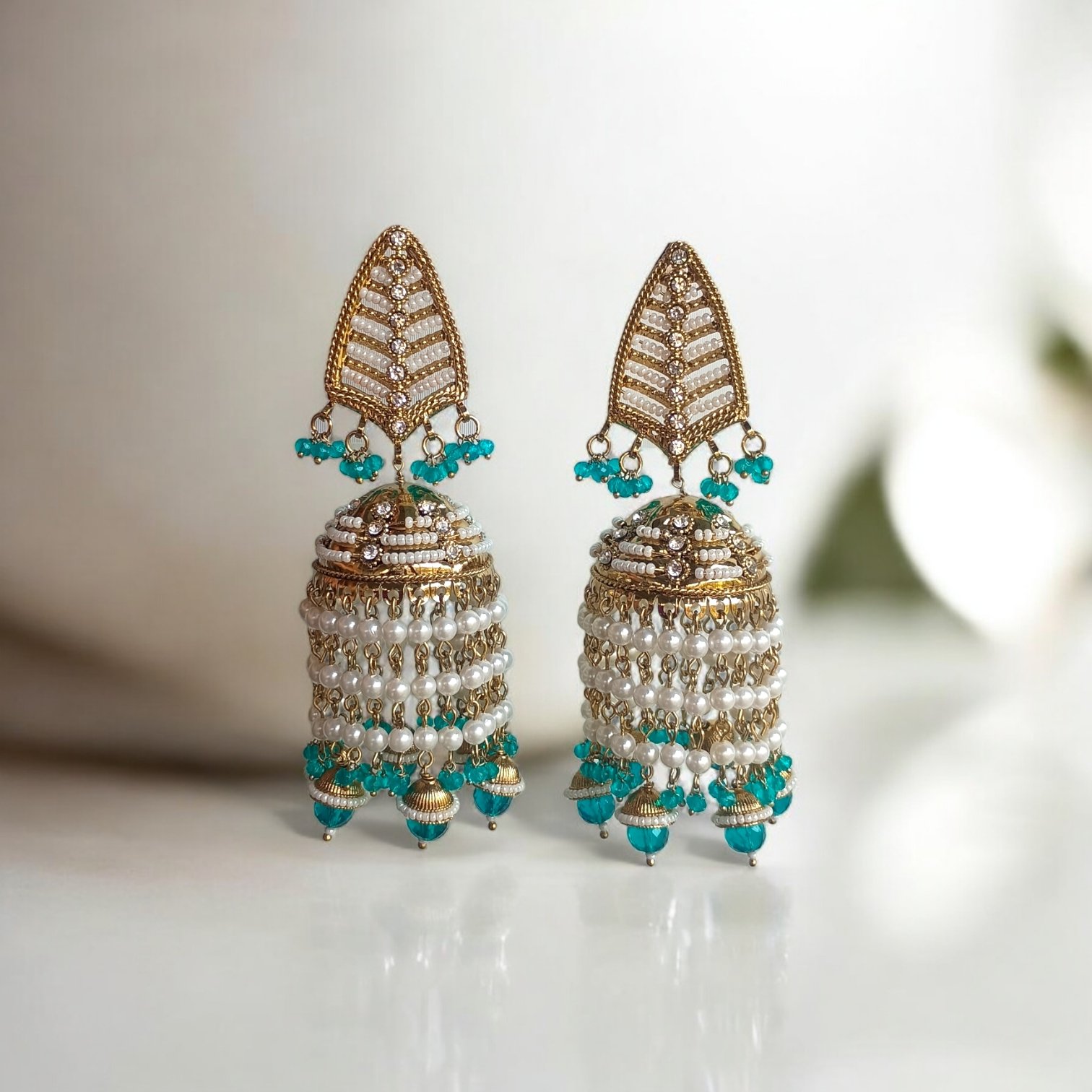 Sophisticated Gold Leaf Jhumka with Teal Bead Drops