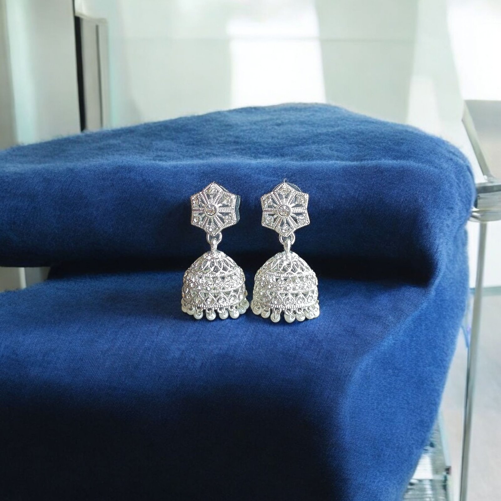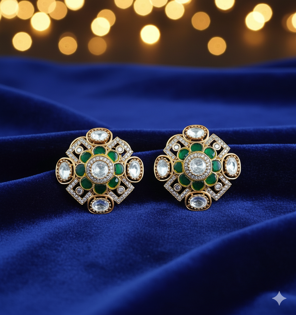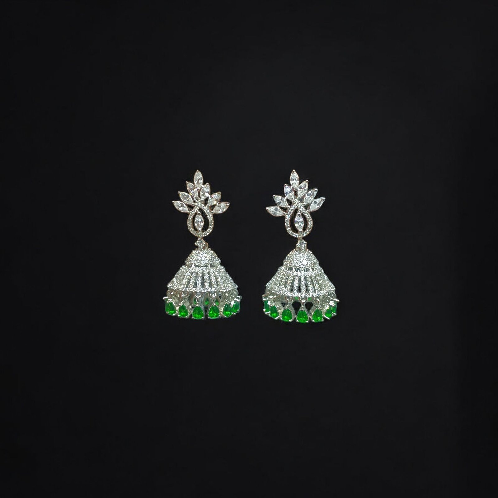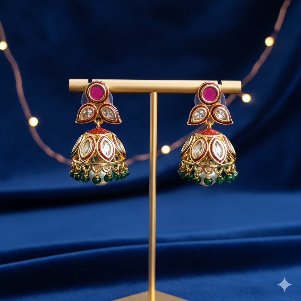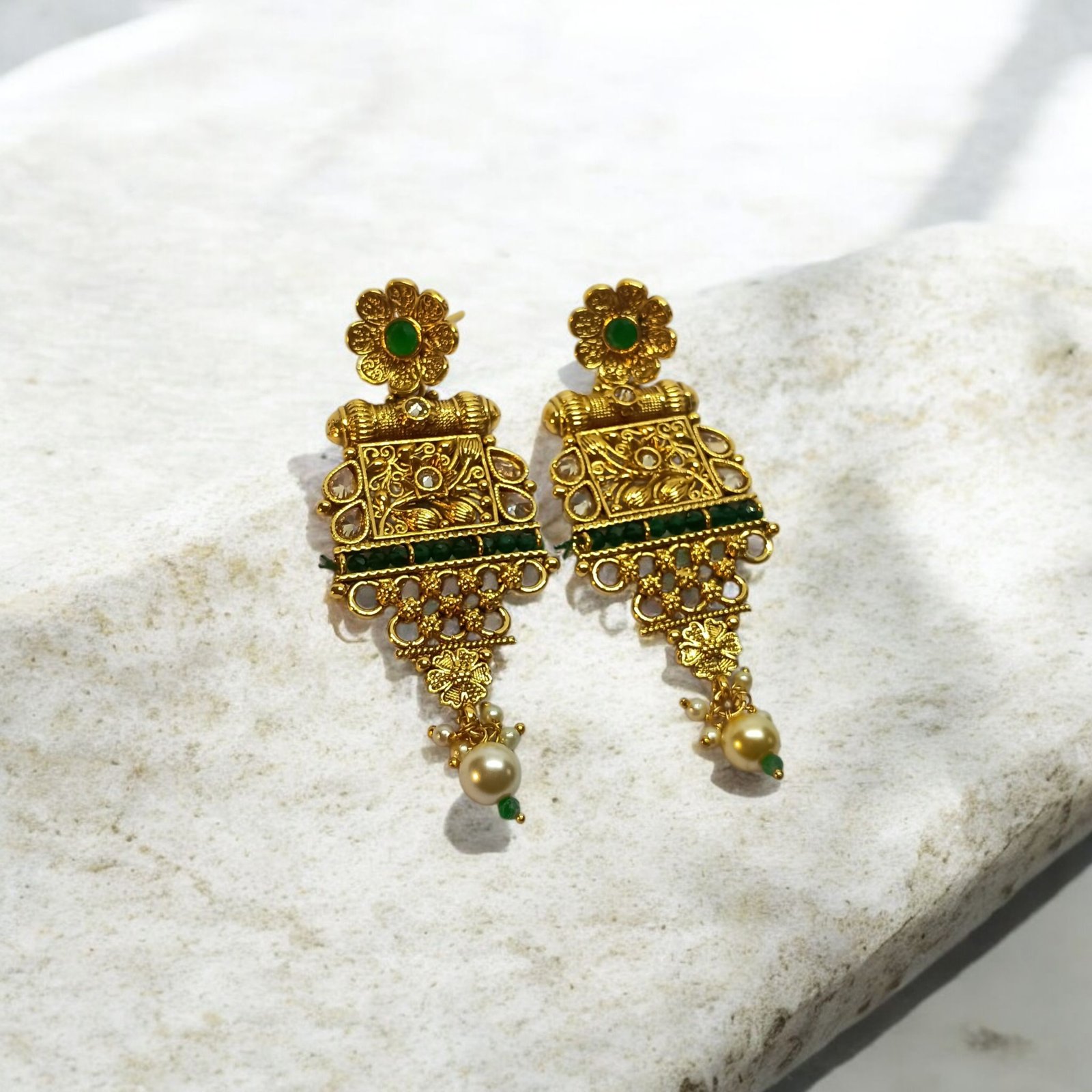 Green Stone Kundan Jhumka and Filigree Pearl Design Dangler