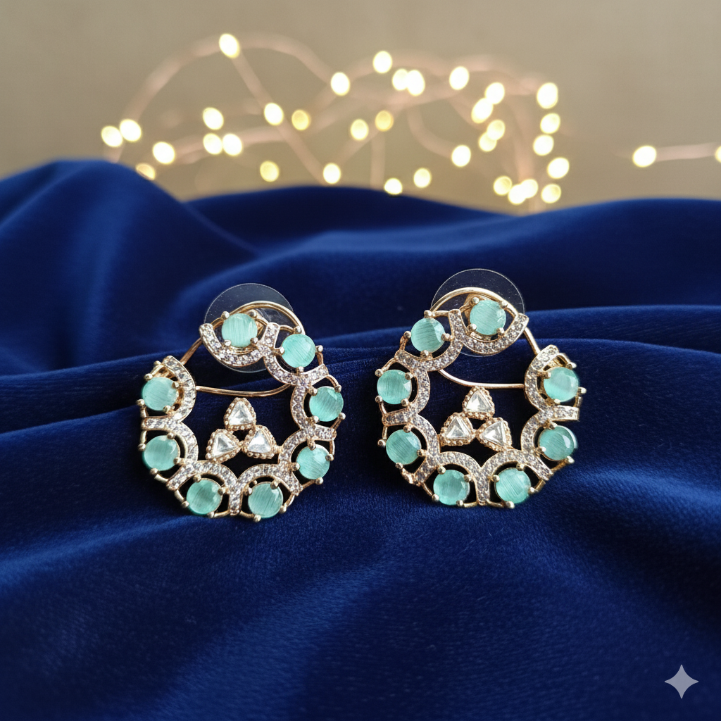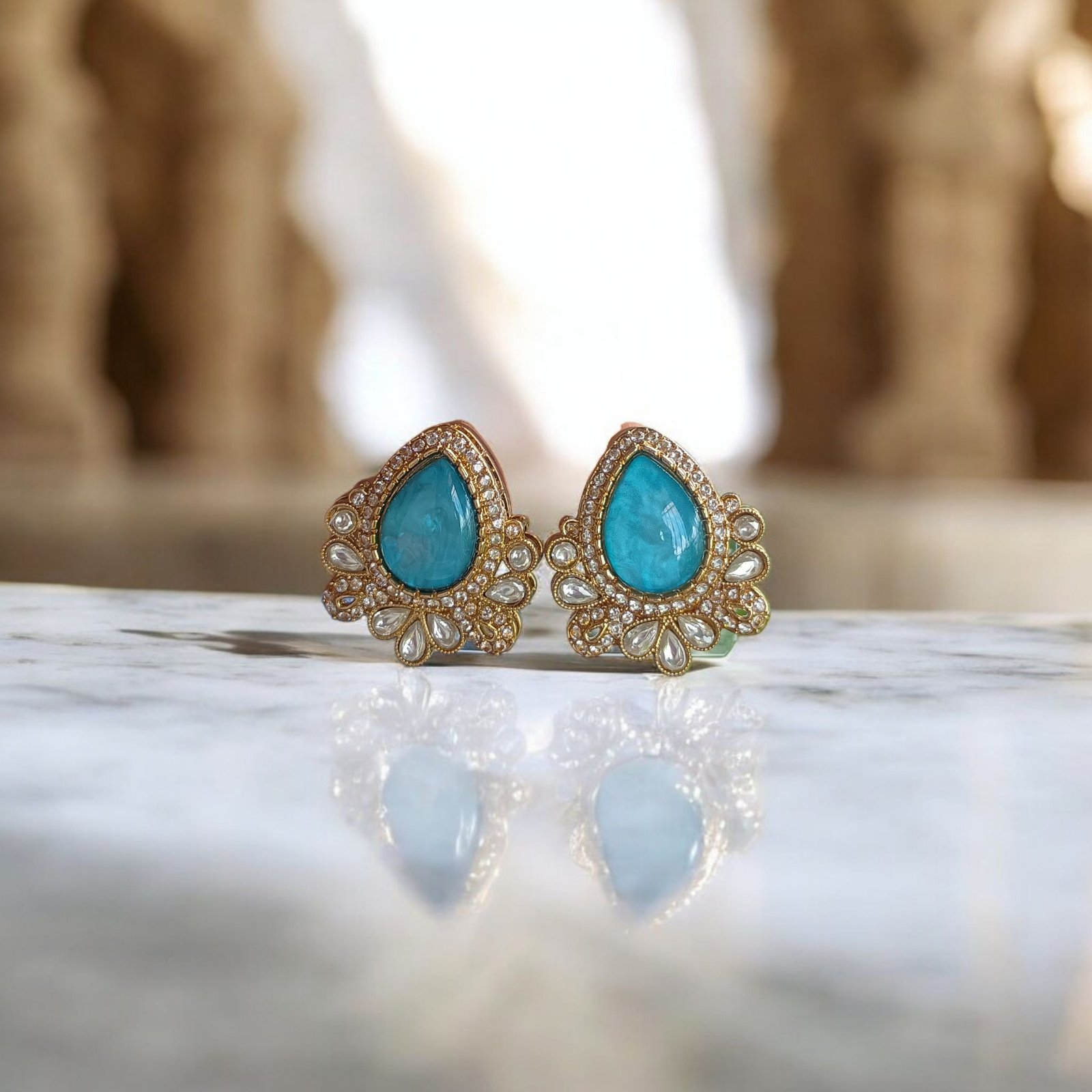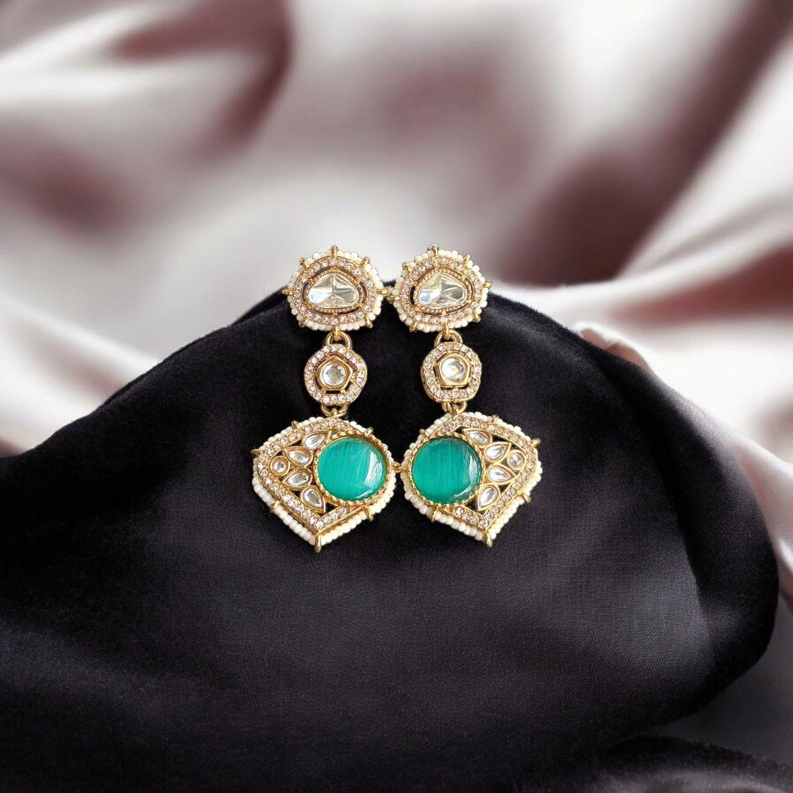 Teal Blue Polki Drop Earrings with Beaded Fringe