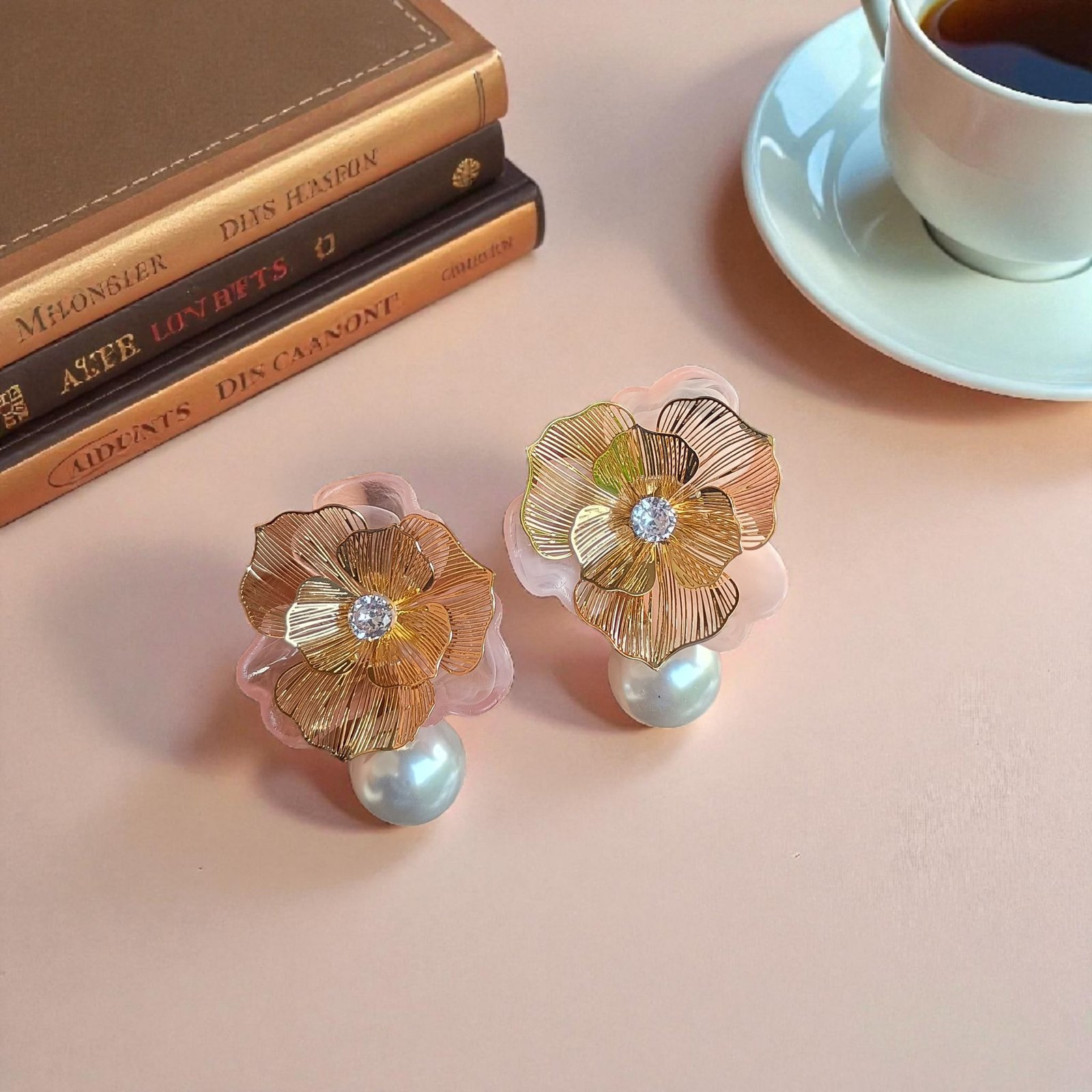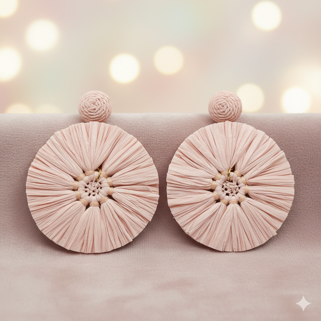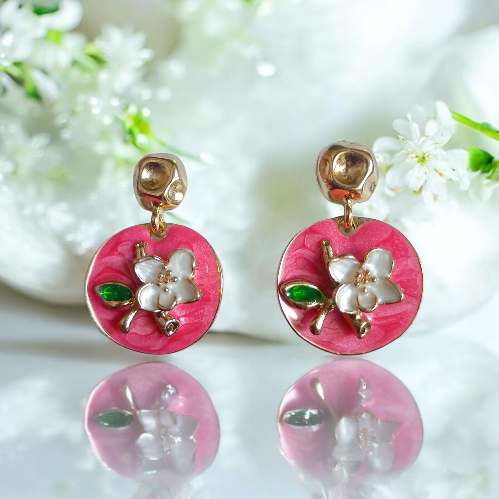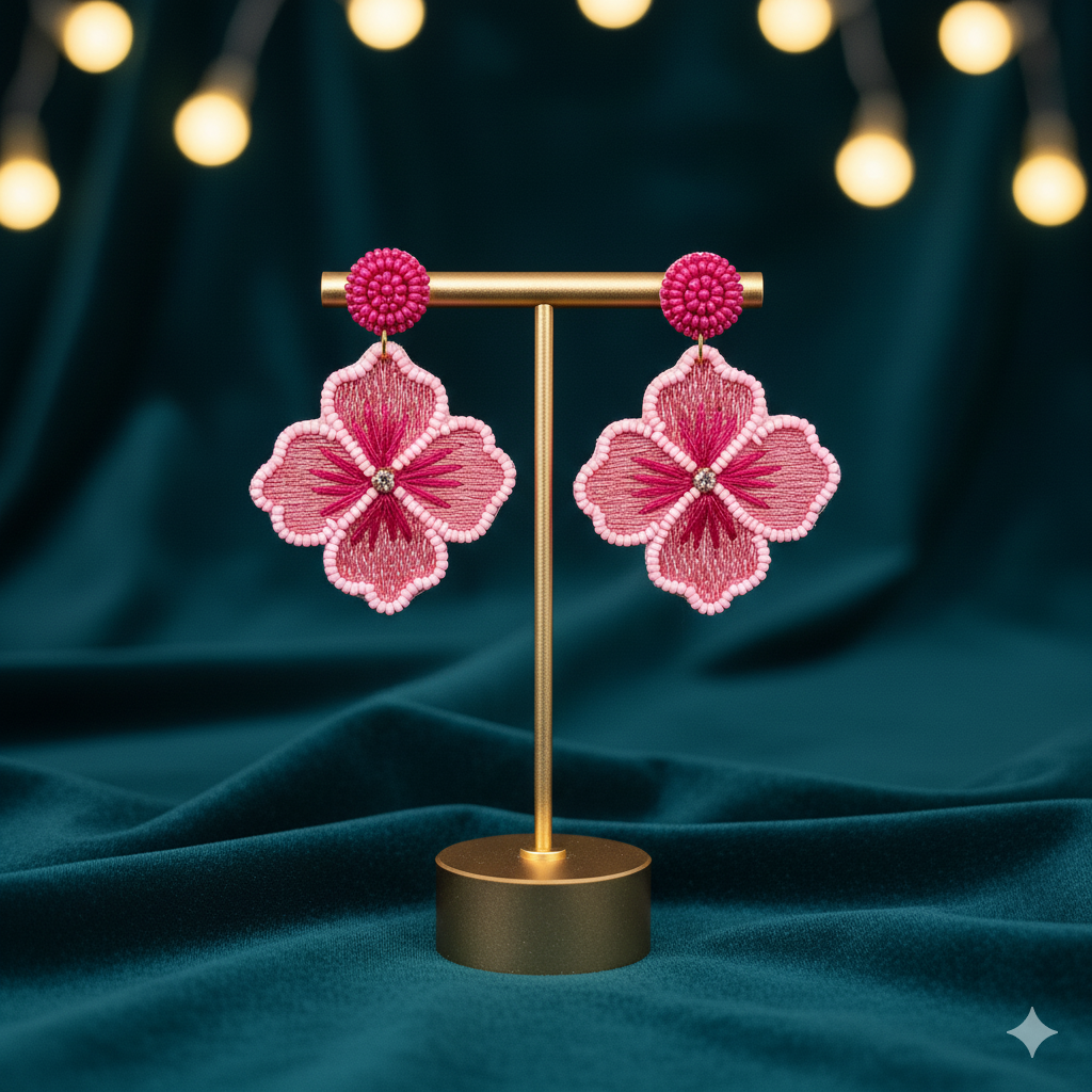 Pink Beaded and Embroidered Flower Dangler Earrings