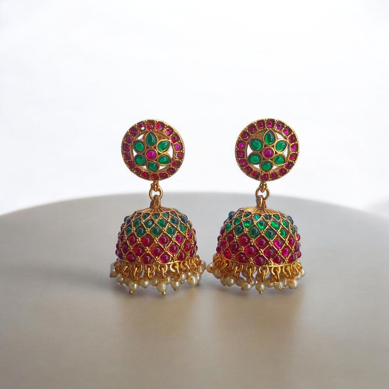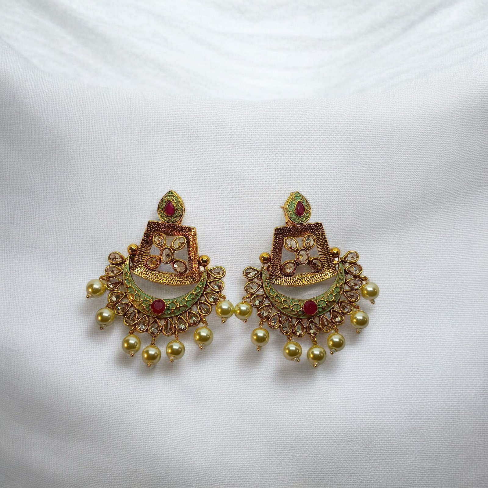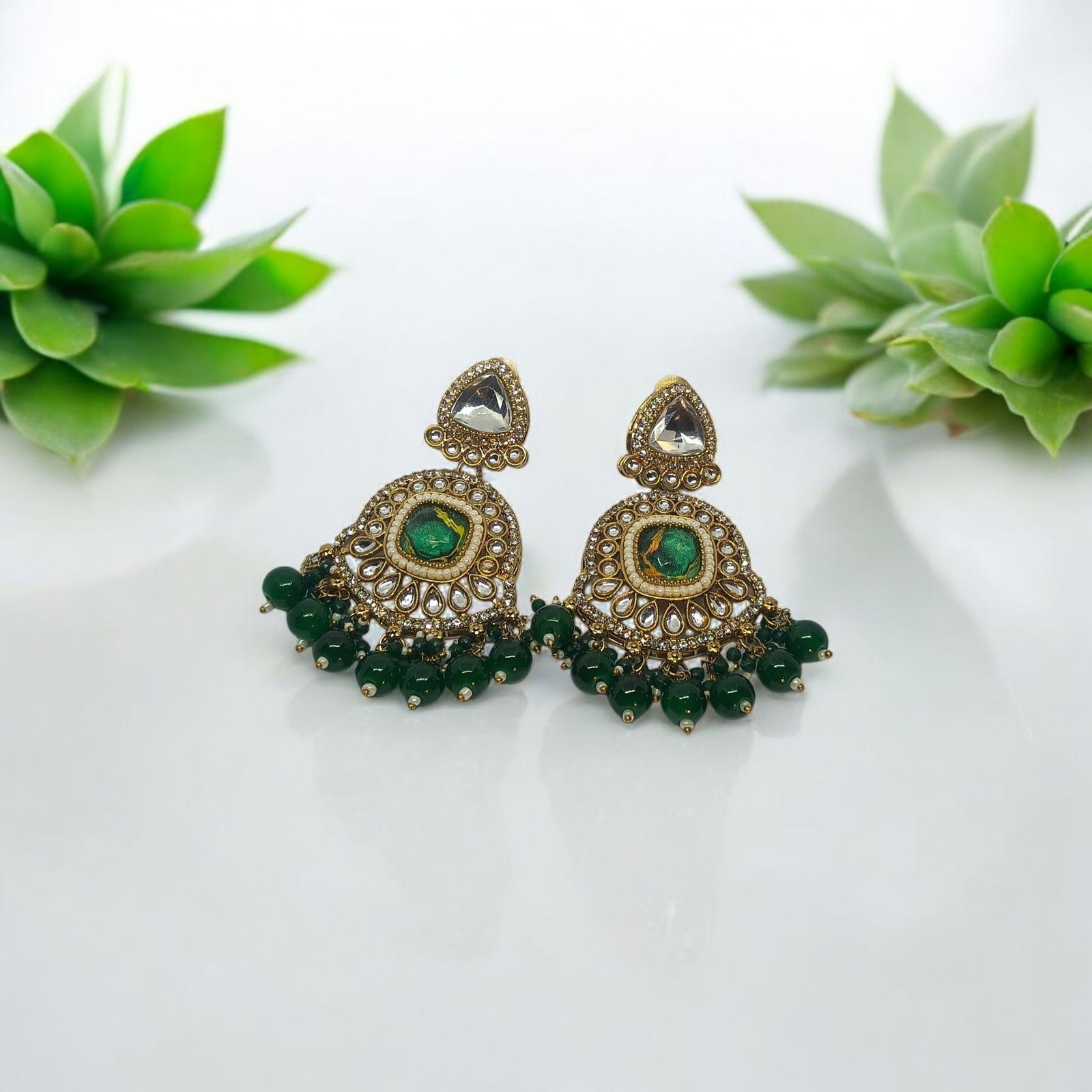 Ruby and Emerald Chandbali with Green Beads Dangler