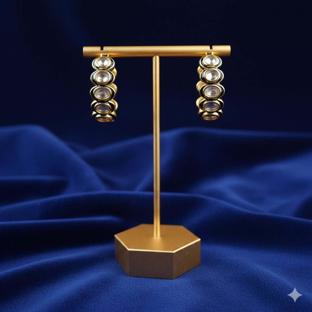 Enamel Green and Pink Kundan Hoop Dangler hanging on a stand