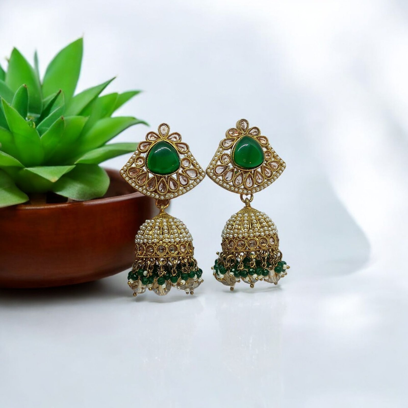 Green Stone Kundan Jhumka and Filigree Pearl Design Dangler