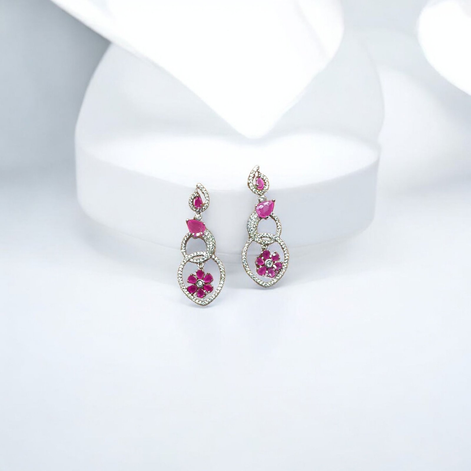 Silver Long Dangler with Ruby Flowers and Links